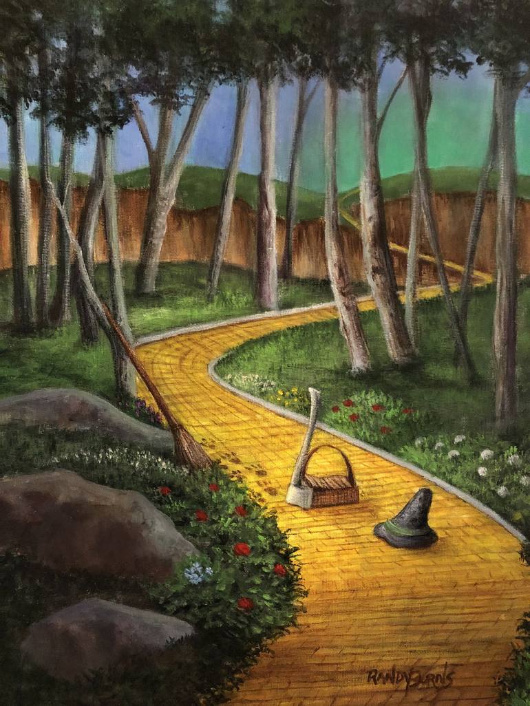 Items left behind: the tin man's axe, the witches' broom, the scarecrow's hat, the cowardly lion's footprints and Dorothy's basket. In the distance is a glow of the emerald city, without a hint of a building. This is a little different viewpoint focusing on the memory of the event and how time leave...