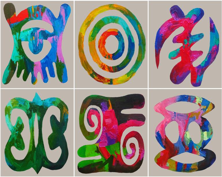 Series-9, Adinkra symbols These six abstract paintings showcase a harmonious blend of symmetry and vibrant color. Arranged in a 2x3 grid, each piece features distinct shapes against a light background. The compositions range from a stylized eye-like form with dripping elements, to a bold spiral desi...