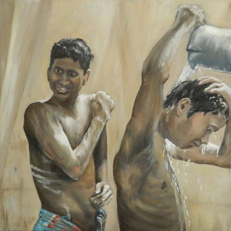 this was inspired by reading a Sunday Magazine and seeing pictures of working men in a factory in Bangladesh - I combined images - I felt the warmth of the man's smile