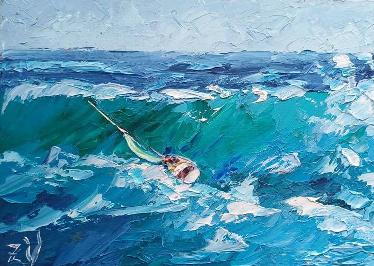 --- Menacing Sea. The oil painting depicts a raging storm at sea. Enormous waves rise, violently tossing a small ship, raising spray and foam clouds. Deep and rich shades of blue and gray convey the tension and power of nature. ---- Unique and exclusive 100% hand-painted, M...