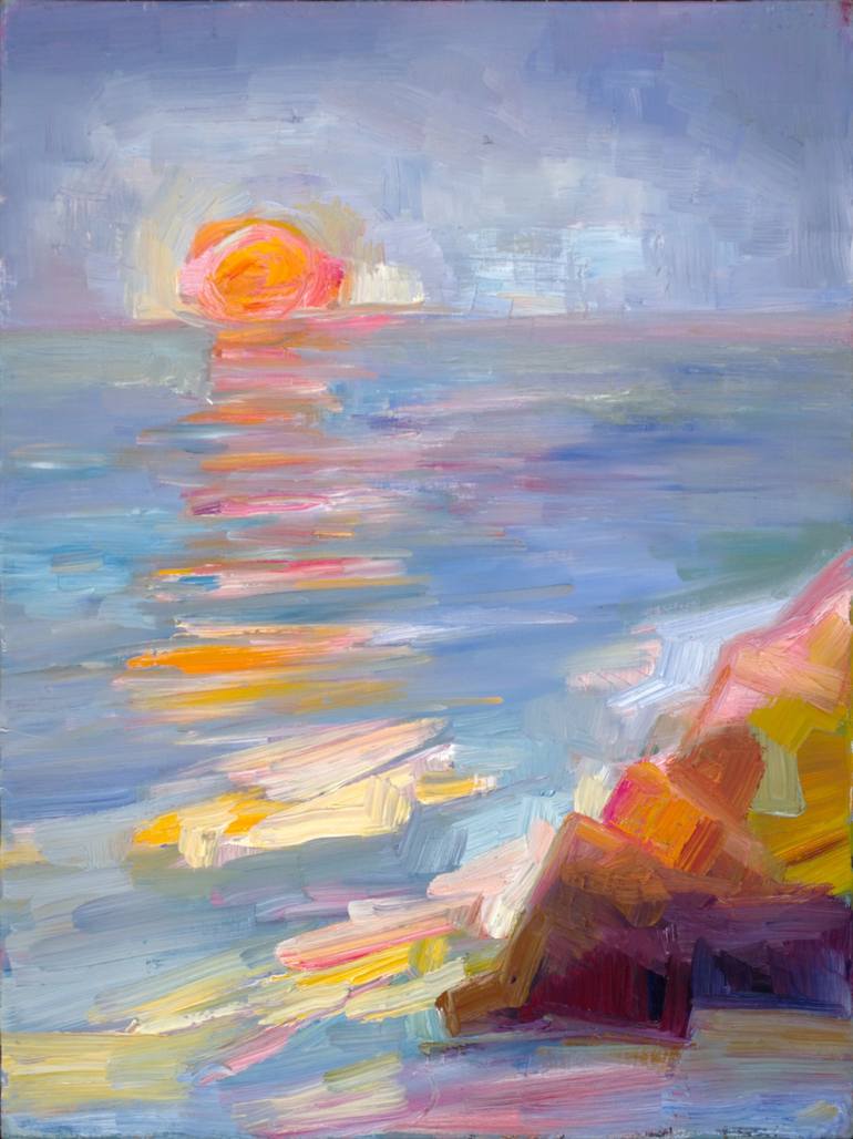This painting was started en plein air, on the beautiful Mendocino coast of the Pacific Ocean. Yet it is close to impossible to catch the glorious moments of sunset in direct painting -- and the weather didn't cooperate: even though I returned to the same spot several days in a row, the sunsets look...