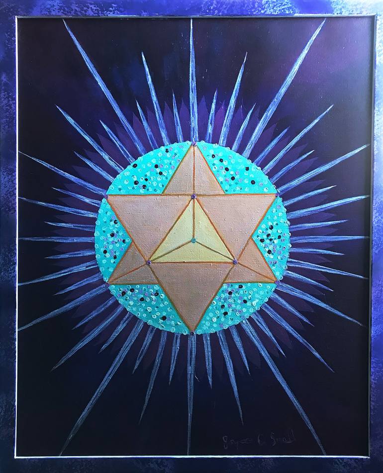 This is a Merkabah, an ancient geometric symbol, alluded to in Ezekiel 1, and in Egyptian texts. It is represented by a chariot, as a vehicle which lifts the soul to heaven. This painting is framed in the same colors used in the painting. My paintings are usually metaphorical. "What I dream of is...
