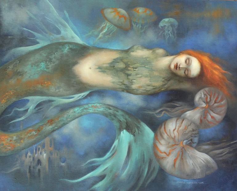 This is another in my mermaid series. It's done with oil paint on archival canvas board. Like all creatures of the deep, mermaids symbolize the unconscious. According to mythology, they are magical and shape-shifting. And they connect us to our higher selves through the gift of intuition.