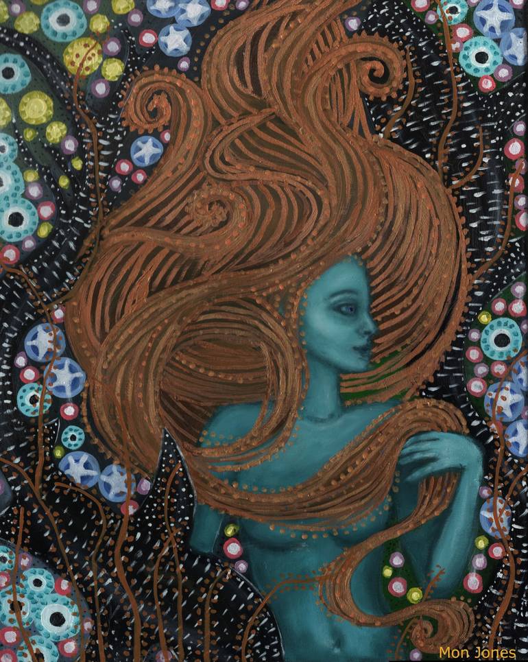 The billowing hair of the mermaid was always something that I wanted to make sure that was a key feature of this particular ocean painting. This is why I decided that I wanted to make sure that it stood out, using swirling shapes of gold. This is a contrast against the black background of the whale ...