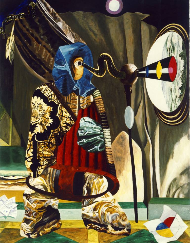 This was inspired by the color theory of printing in which each and every color can be made by using only three colors: red, blue and yellow. The figure in the painting uses a strange kind of device which enables him to analyze the landscape (turned 90 degrees) he is looking at through a window. As ...