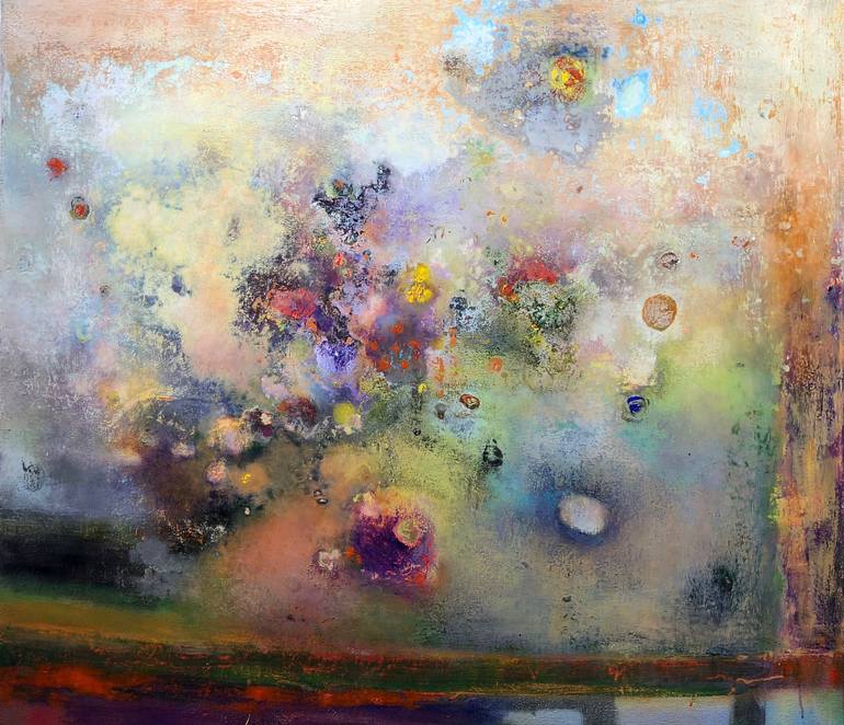 An intuitively developed image that has the characteristics of eroded, distressed surfaces interfaced with atmospheric spaces, representing some of the things that fascinate me. I like textures of time worn paint, stone, lichen, etc. I also like the ephemeral and changing shapes of clouds and vapors...