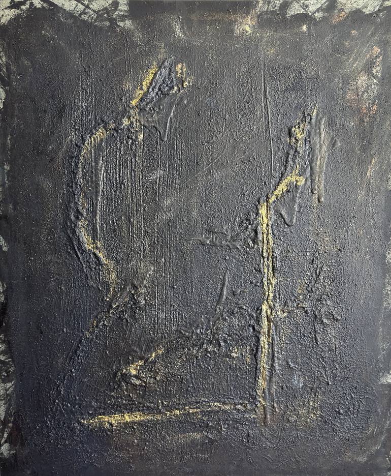 In Metamorphosis of Light, a radiant golden crack disrupts a dense, textured darkness. The relief-like surface evokes ancient artifacts or weathered rock formations, as if the canvas itself tells a story deeply rooted in time. The interplay of shadow and light, rough textures, and shimmering highlig...