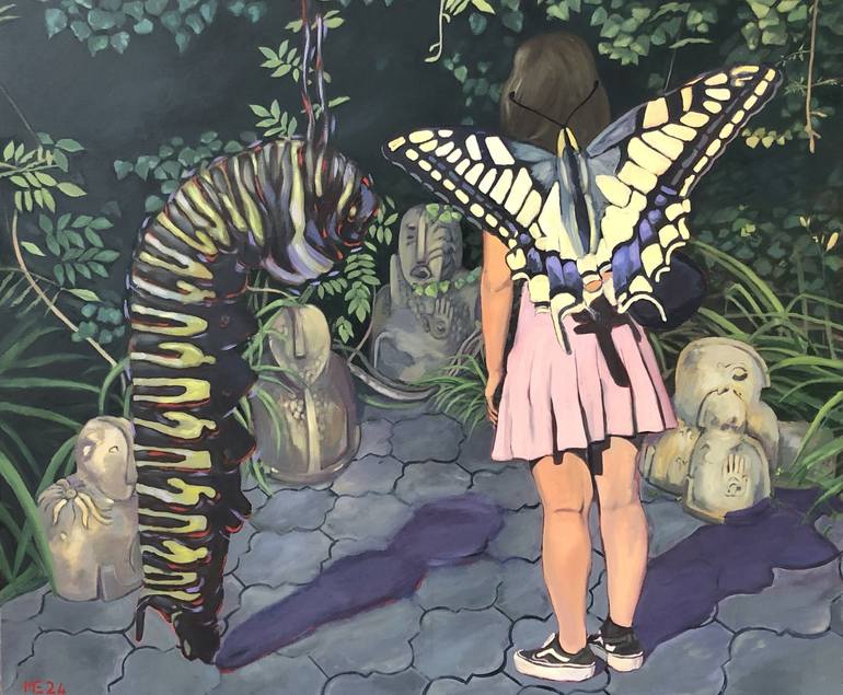 In this painting I represent the metamorphosis of a caterpillar into a butterfly in the presence of the female figure from behind, who appropriates the myth in a ritual space populated with ancient idols.