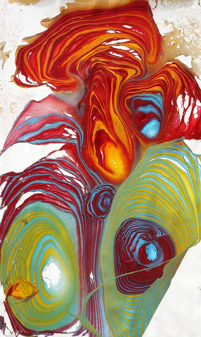 Four colours painted in abstract fluid ripple-like motions on canvas and coating with high gloss UV resistant varnish. Painting shipped stretched, safely secured in a wooden crate with Certificate of Authenticity.