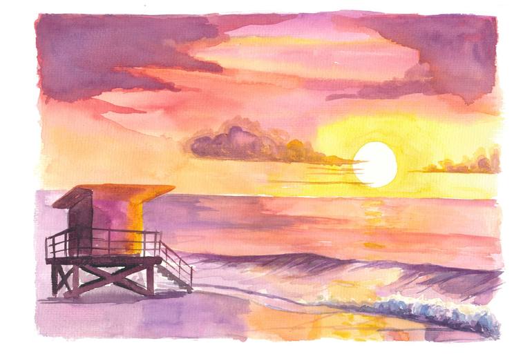 Miami Beach Florida Sunrise with Baywatch Tower - watercolor on paper