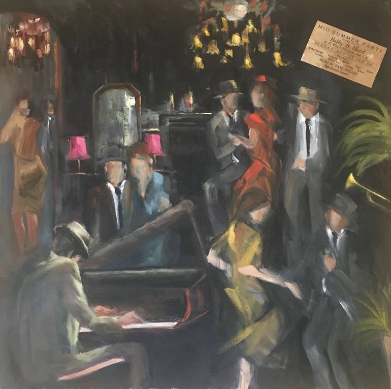 Inspired by New Orleans jazz music in early 1930s, a typical in-house dance party scene with people of any social background, dressed up with their best suite