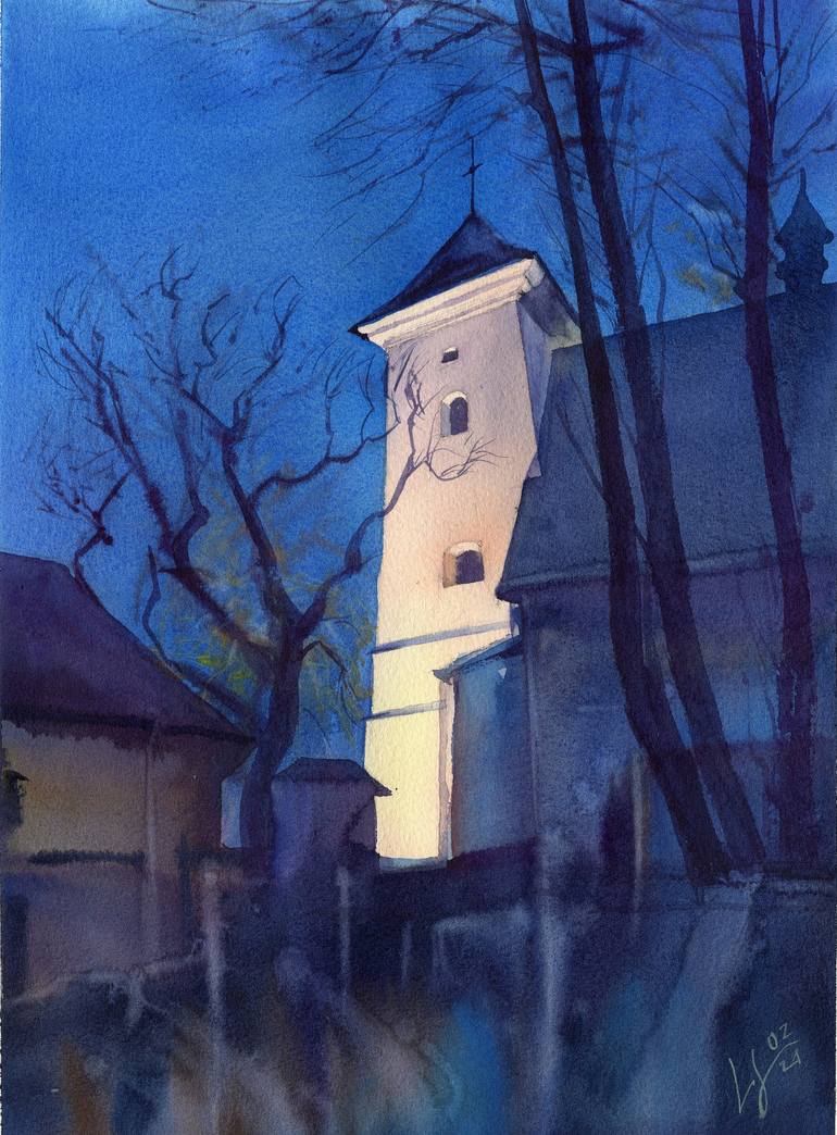 This watercolor painting depicts a belfry located in the city of Mikonov in Poland. In the evening illumination, the building simply shines, and the ancient architecture is the real charm of this small cozy town in the center of Europe. The work is done with professional light-resistant watercolor p...