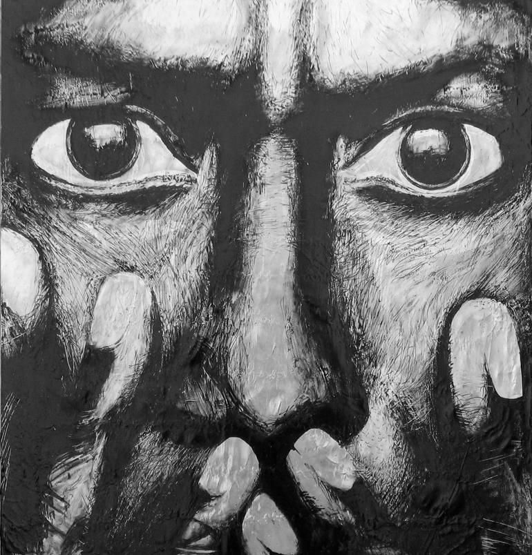 This painting has a shiny and reflective aluminium surface that is mounted on a big wooden background.