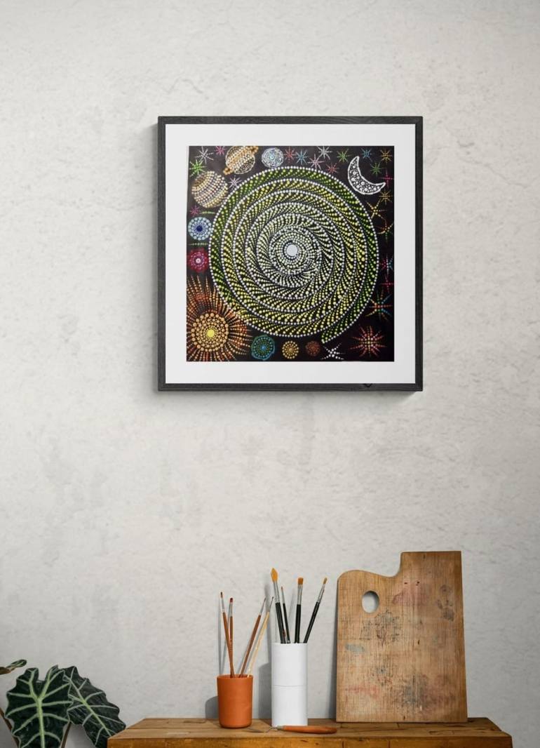 I was teaching my daughter a topic about milky way, universe, star, moon, galaxies, planets. It gave me an inspiration to picturize it for her so that she understands this universe. This is a painting of starry whispers woven in the night, the Milky Way captured in dots of light. I have chosen b...