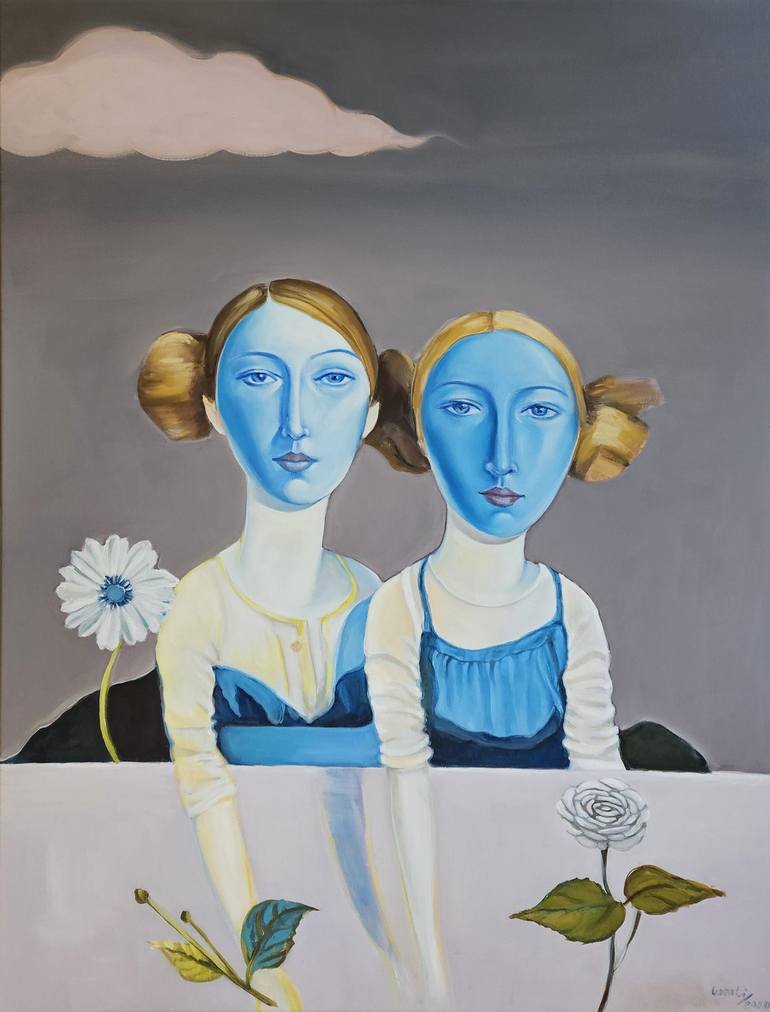 In this painting, I explore the duality of feminine existence—the way inner landscapes quietly mirror or contrast the outer world. The two figures, nearly conjoined yet distinct, represent not two people but two aspects of the same self: the observer and the experiencer, the seen and the hidden. The...