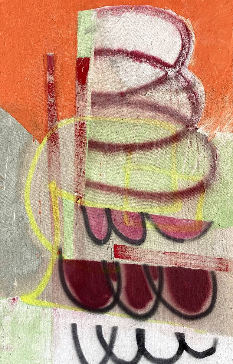 This piece has an energetic and urban feel. This piece was painted in the summer in Albuquerque in a studio garage with temperatures over 100 degrees outside. The sun is beating down and dust whirling about...Neighbors walking dogs, the sound of ambient music drift out onto piñon trees and old worn ...