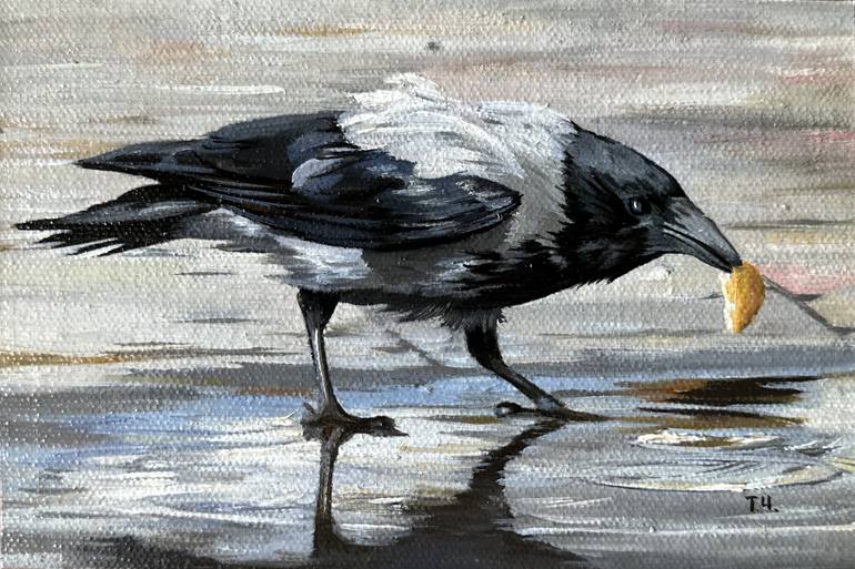Before us is a typical city crow, which, like many of its relatives, does not miss the opportunity to feast on something edible. This time there was a bun in her beak, which she clearly intended to soak in a small puddle that had formed right on the asphalt. Despite its seemingly unpresentable appe...