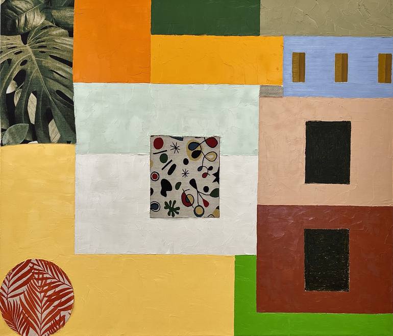 A piece of cut textile…glued centrally on the canvas…resolve this… Add more textile cut outs, glued, then design the painting around the collages. Looking out of the window of the Paris art studio I see zinc rooftops with rust coloured shutters and a shadow vertical… Underneath the roof two levels f...