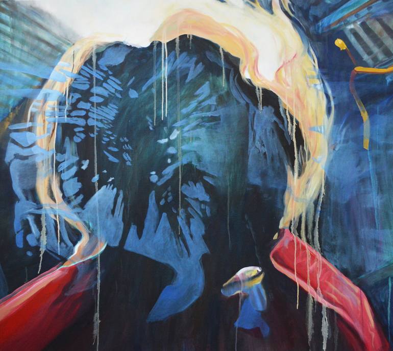 this painting is based on a photograph of a silhouette against the light. The backlit effect brings darkness to the face, leaving it in suspense. Finally, a texture of projected shadows ends up generating a layer of reflection.