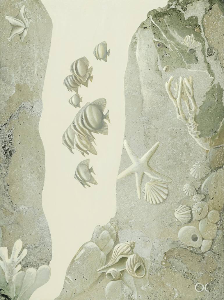 Misty Lagoon, oil on canvas painting 80x60 cm. Misty underwater coral reef view in twilight time.