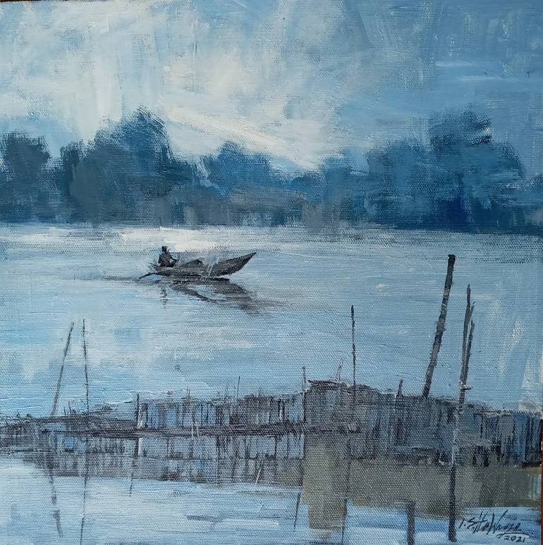 It's a misty morning and the world is still asleep. The sun has not risen, making way for light to come through. But, a man on a boat is seen in the horizon. For he carries the weight of the world, nothing stops him from setting out to catch the day's prey. The painter has captured the perfect momen...