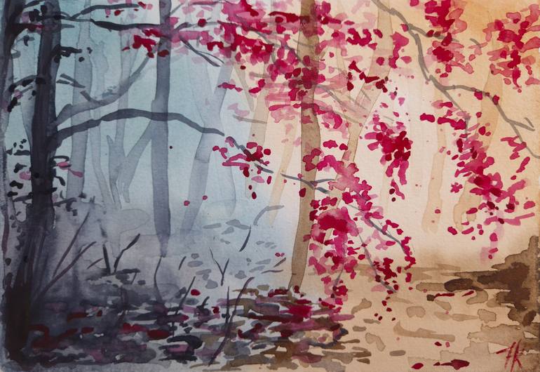 This watercolor painting takes you into a mysterious forest where the cold morning mist meets the warm glow of blooming sakura. The left side is painted in muted blues and grays, evoking depth and silence. The right side radiates warmth with soft beige and pink tones, symbolizing nature’s awakening....