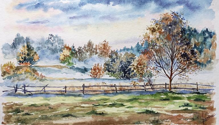 Cloudy valley landscape. Field scenery. Fog in the field. Original watercolor painting. An exclusive unique gift for any special occasion and holiday. Interior decoration. Memory to your relatives, family and friends. Original present. Nature is beautiful in all manifestations. A look at he...