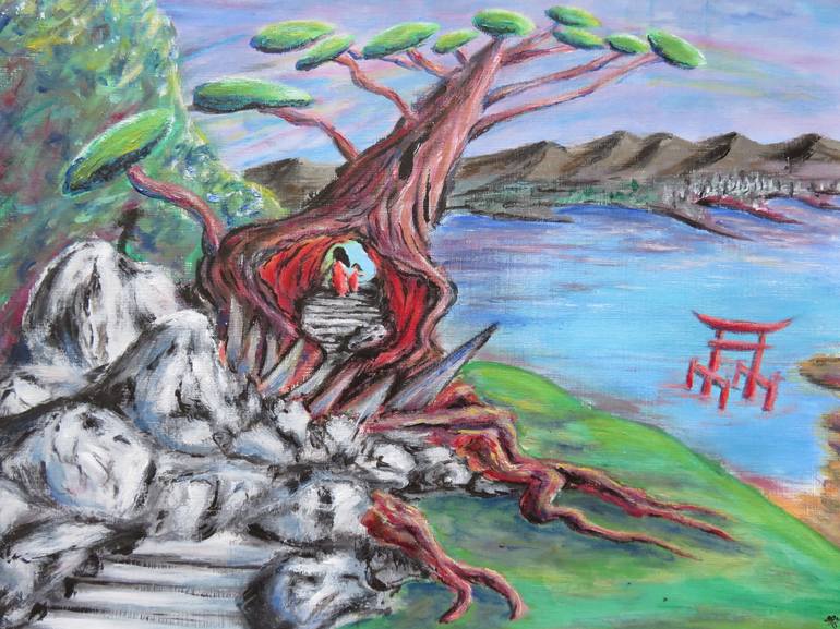 Miyajima island, walking in the path crossing a big tree