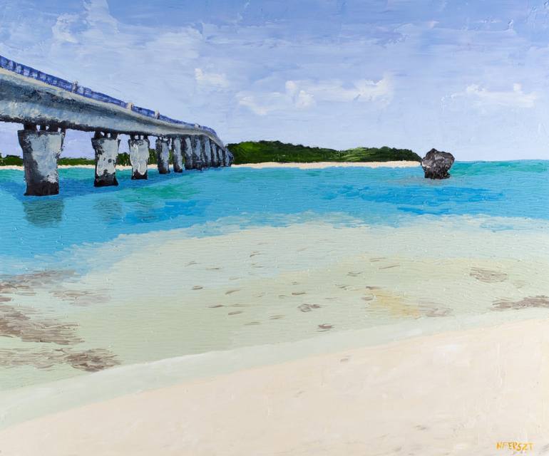 Bridge connecting two islands over a turquoise channel in Miyakojima Okinawa, Japan.