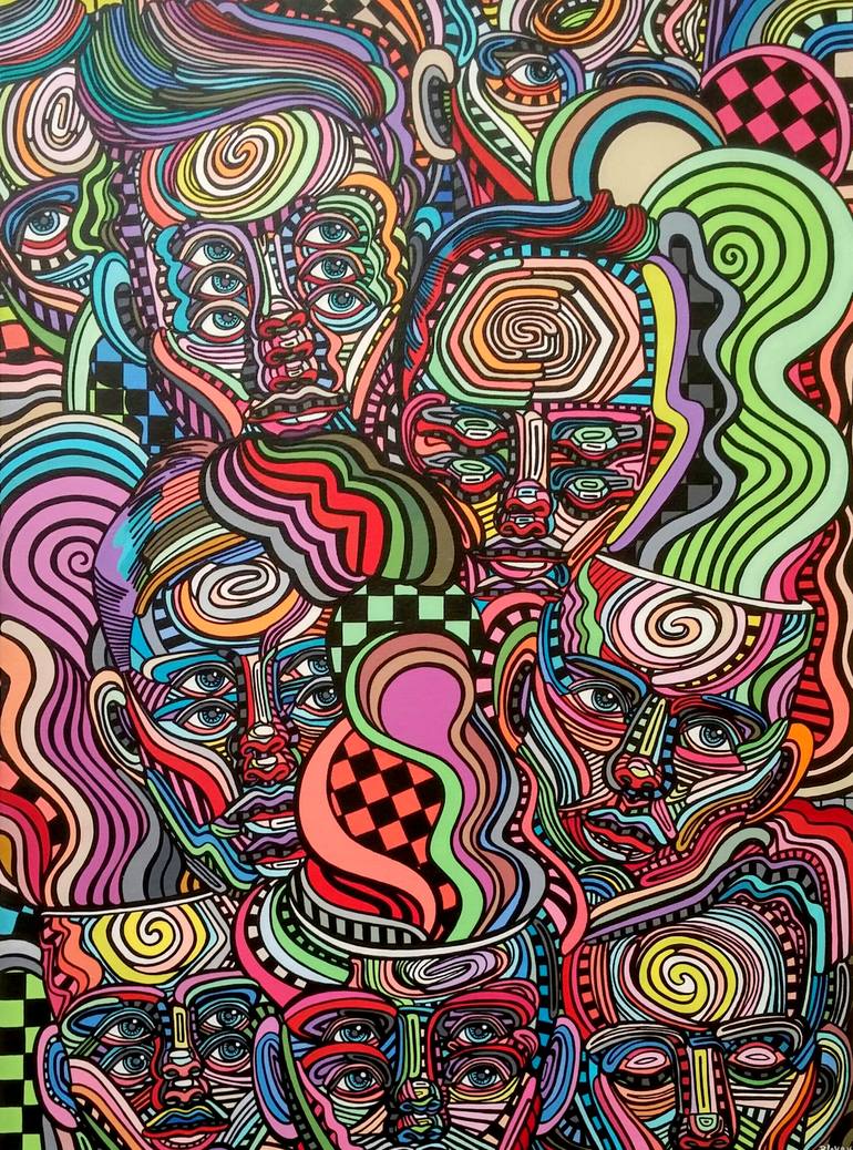 “Mod Facade” is an explosion of color full of detail, and a celebration of creative inspiration. Every time you look at it you will see something new. The composition is dense with stylized faces, some with replicated facial features made from bright, rich flat color shapes and patterns - in blues, ...