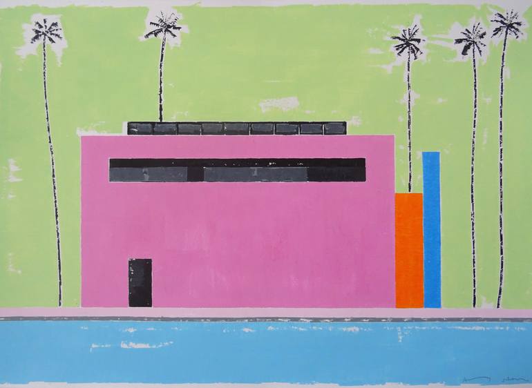 Modern Home, Malibu, California Acrylic on paper 2017 The design of this house somewhere between Paul Smith Shop L.A. and Luis Barragan. Ready for framing Signed by the Artist High quality heavyweight 250gsm paper