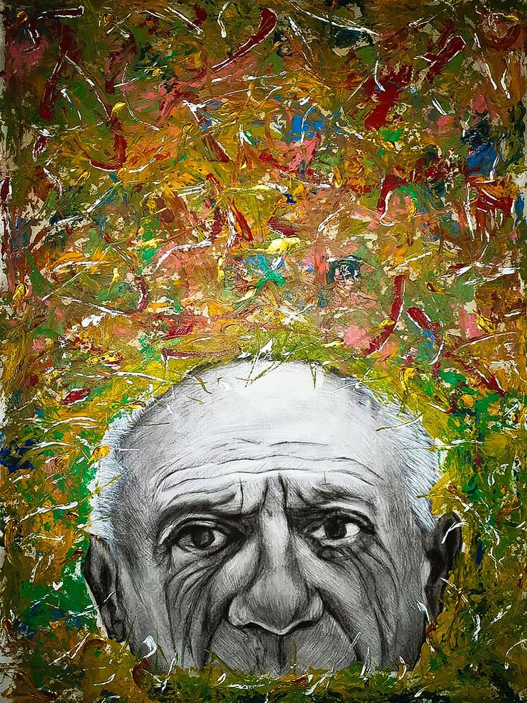 Original oil painting and charcoal portrait on paper. This is the best possible quality made by Ayesha khan in person. 'Modern Pablo Picasso' oil painting Size: '20x30' (52 x 77 cm) Condition: Brand new Type: Palette Knife and charcoal. The 100% hand painted by Ayesha khan using oil paint, paper, pa...