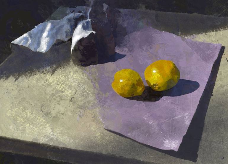 I bought two beautiful quinces at the market together with flowers that they wrapped in purple paper.... When I saw them laying in the sun on my garden table I was sold. It made such an appealing still life composition and had to make a painting of these quinces with purple paper. The quinces neve...
