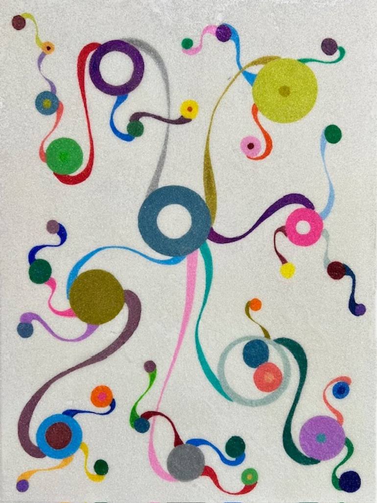 "Momentum" is an original 18" x24" lyrical abstract acrylic on canvas painting I made in May and then added a coating of glass beads in gel medium in June. The paints are a combination of metalic colors that shimmer and opaque pastels in about 30 different colors. There is no dominant color. This...