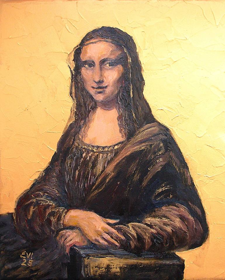 This is an original oil painting titled "Mona Lisa" created by the artist EVI in the UK. The painting is done on a 10x12 inches linen canvas in a contemporary style, combining aspects of expressionism, figurative art, abstract, naïve art, and impressionism. It features a portrait of the iconic Mon...