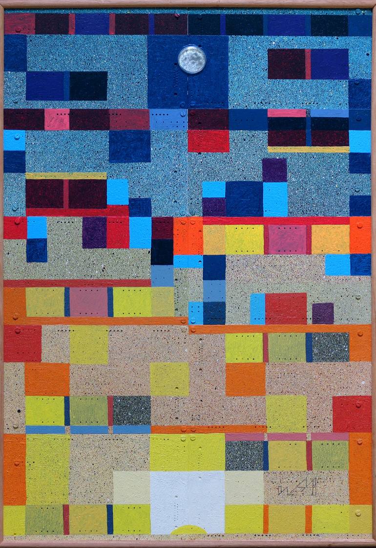 Technique: Oil + objects on electronic circuit boards Several electronic boards that I usually use in my works have different geometric designs in the paths of the printed circuits. Exploring this internal geometry, I decided to explore the squares, rectangles and circles that exist on some plates...
