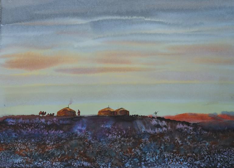 This painting beautifully captures the essence of nomadic life against a breathtaking landscape. The vast wilderness stretches endlessly, providing a backdrop of natural beauty. The nomads, with their tents and herds, symbolize the enduring connection between humanity and the land. The painting depi...