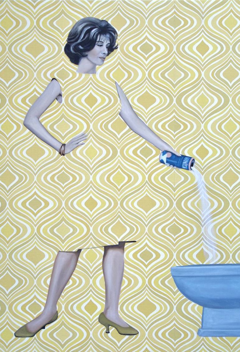 Original oil painting on vintage wallpaper mounted on wood panel. Monika Cleaning is painting number 99 of the series "Disappearing Housewives". In this series I paint women more or less disappearing or dissolving with the background/wallpaper while tending to housework. The series is dedicated to t...