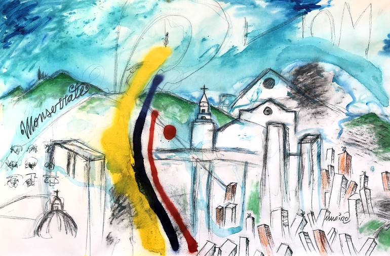 Monserrate is an imposing mountain that serves as a natural background for the Colombian capital. A quick cable cart ride to the top gives you an impressive view of the valley in which Bogotá sits. This painting was executed in part on top of Monserrate, depicting some of the elements that can be se...