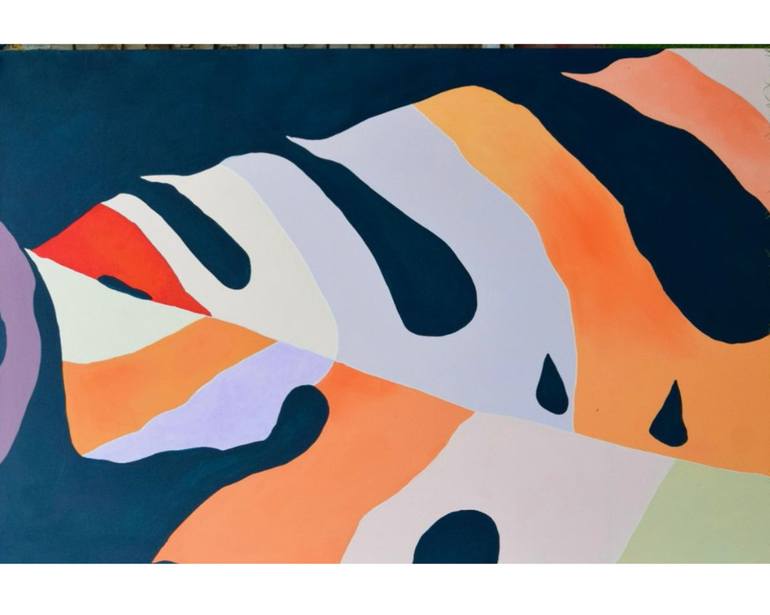 This original artwork is a bold and expressive abstract painting inspired by the organic patterns found in nature, particularly the intricate textures of tropical leaves. The interplay of deep blues, warm oranges, and soft lilacs creates a dynamic visual experience, evoking both movement and harmony...