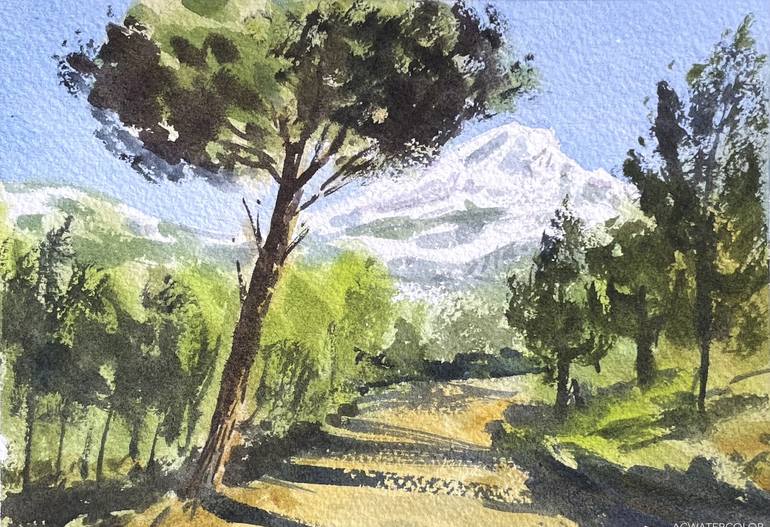 Watercolor of a famous view in Provence, the Mont Ste Victoire. Extrafine watercolors on Arches cotton paper.