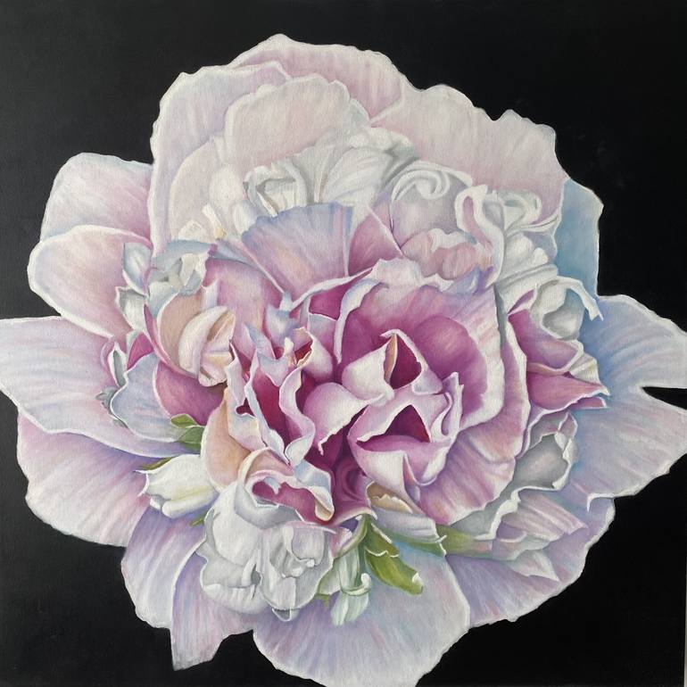 This stunning painting is now sold! However, you could commission a similar painting for the same price and size or a 36x36 ( for higher price) or a 24x24 for a slightly lower price. I love peonies although they have such a brief life. Painting a single bloom allows me to concentrate on one gorgeou...
