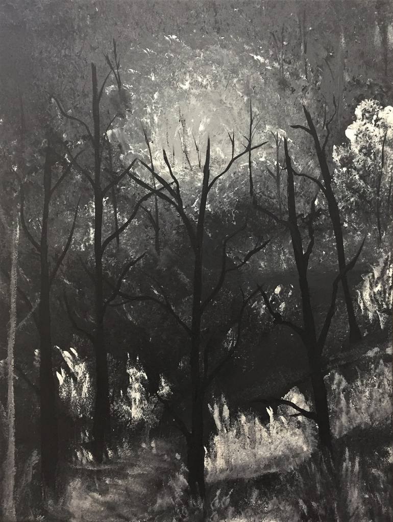 A dark, misty forest that wakes your senses of tranquility and mystery all at the same time. Tall trees, paths and bushes; nature at its finest and purest form. Without colors, just the naked truth. Initially I was going to add a lot of color to this one. But I couldn't. This painting stopped me i...