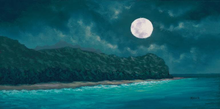Moonscape – there are times when the Moon is so close to Earth that it almost seems like you could reach up and touch it. Or in this case, being in such close proximity that you could jump from the outcropping of land and arrive on the Moon with little effort! This seascape oil painting was painted...