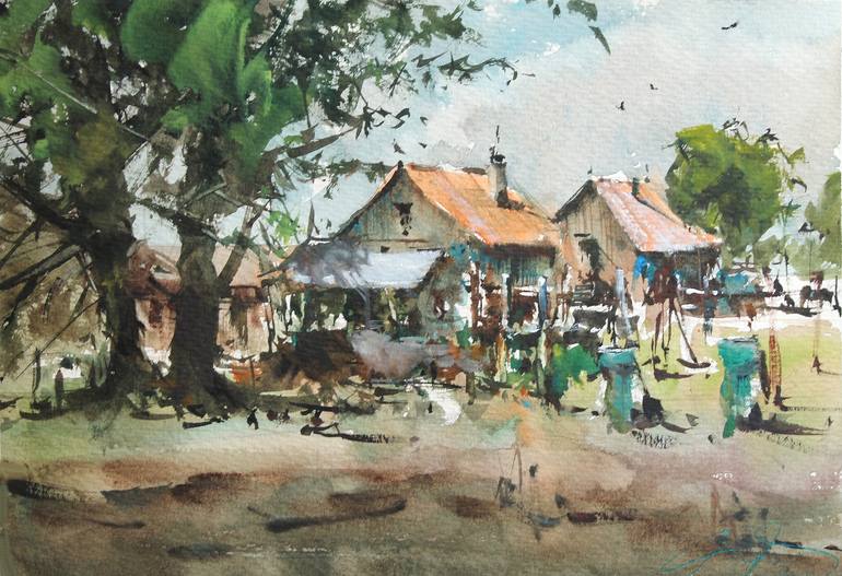 Watercolor plein air 8.5 H x 12 W inch.(21x28 cm) 'Moravian Country House' I made this view during a warm spring afternoon in a typical rural area with country houses, into Moravia region (Czech Rep.). Made in situ 2019 on paper watercolor 300 gsm rough with deckle edges and white border.