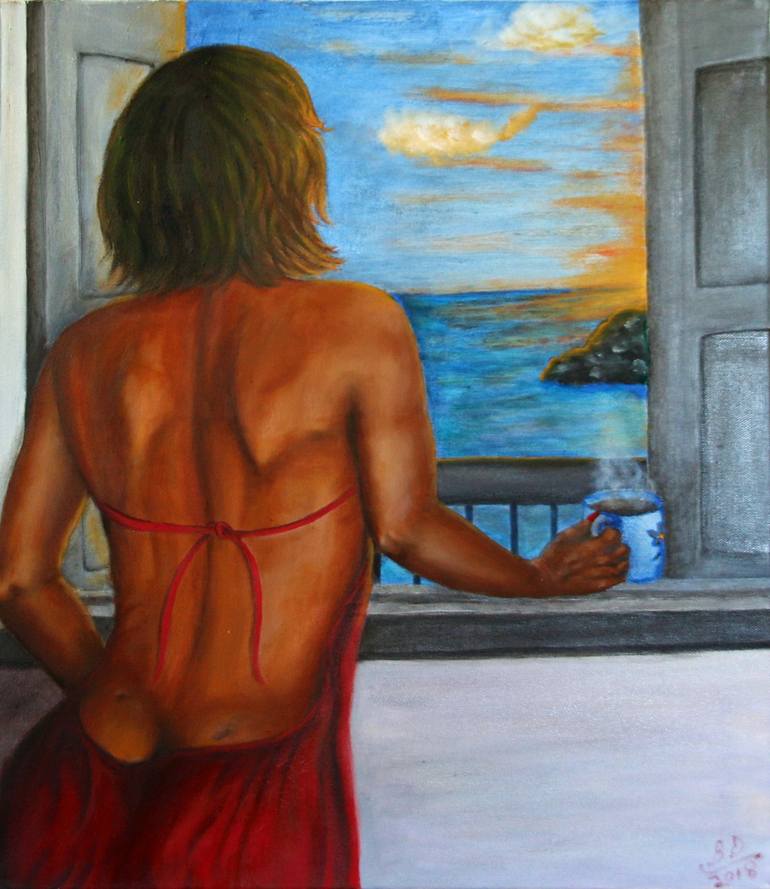 This original oil painting on canvas captures a serene morning scene. A woman, partially revealed, savors her coffee by a cottage window, her blond hair catching the light of the sunrise. The artist masterfully uses paint to portray the vibrant colors of the sunrise over the sea. The expressionisti...