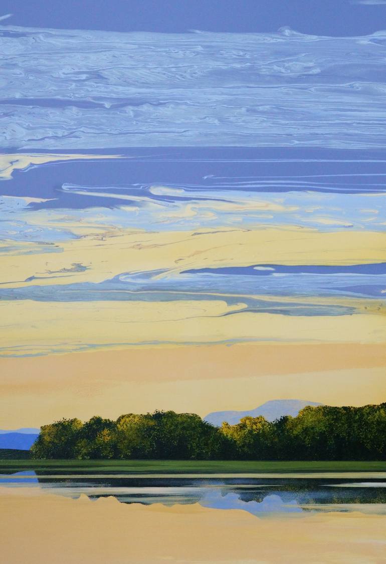 Morning Stillness is my exploration of the quiet, meditative beauty of dawn. I wanted to capture the way the sky gently awakens, blending soft blues and warm golds as light emerges over the landscape. The swirling clouds create a dreamlike atmosphere, while the dark tree line and its reflection grou...