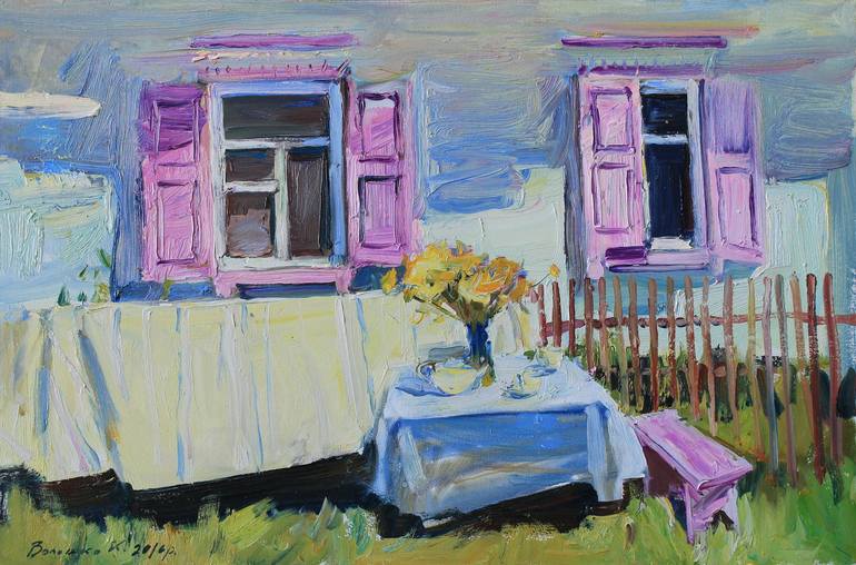 ARTIST: Karina Voloshk MEDIUM: Oil on Canvas DIMENSIONS: 40 x 60 cm / 15,7x23,6 inch WORK: Original Oil Painting, Handmade Artwork, Still Life DESCRIPTION: Step into the inviting charm of "Morning Tea Party," a delightful painting on canvas that beautifully captures the brightness and comfor...