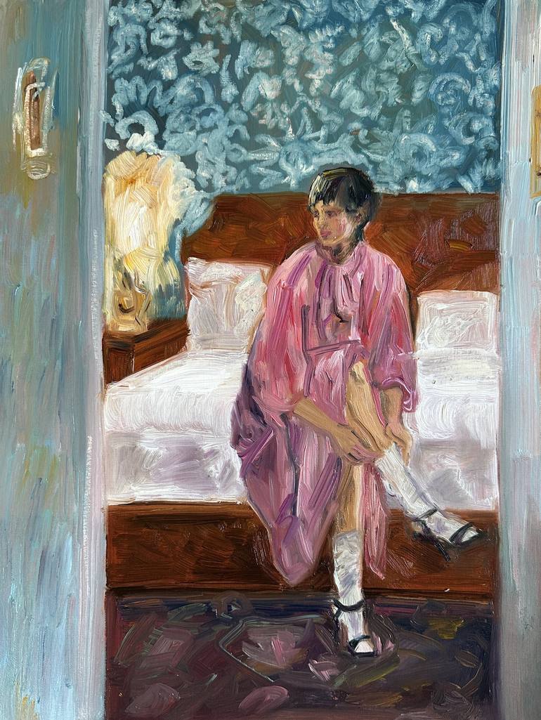 A charming moment of femininity of morning dressing in the light of a bedside lamp.The artwork is done with oil paints on special for oil paper. Fixed with spray varnish and framed. The certificate of authenticity is attached.