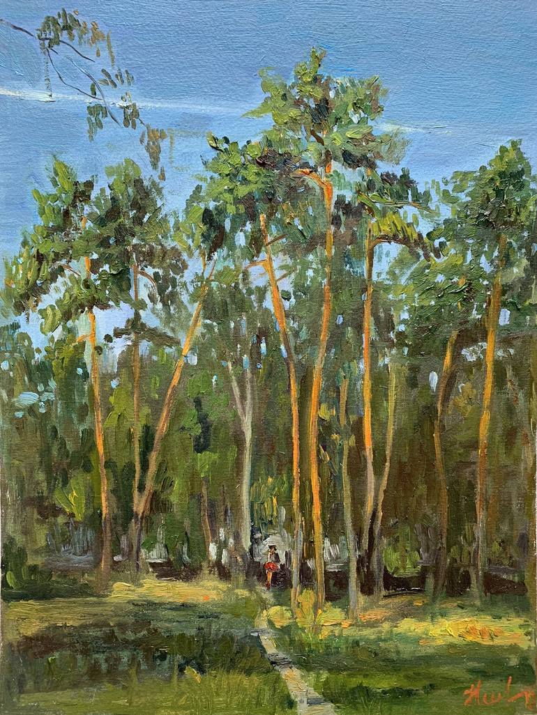 The picture was painted en plein air in Spain. I tried to convey the impression of a bright blue sky and walking in pine forest